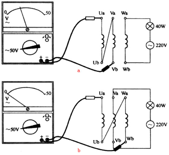 交流法判别绕组首尾如图3a所示,先讲两相绕组的两个端子连接起来,万用表置于交流电压档,红、黑表笔分别接此两相绕组的另两个端子,然后给余下的一相绕组接灯泡和220V交流电源,如果表针有电压指示,表明红、黑表笔接的两个端子为异名端(两个连接起来的端子也为同名端),再更换绕组做上述测试,如图3b所示,图中万用表指示电压值为0,表明UbWa为同名端(UaWb为同名端)。找出各相绕组的同名端后,将性质相同的三个同名端作为各绕组的首端,余下的三个端子则为各绕组的尾端。