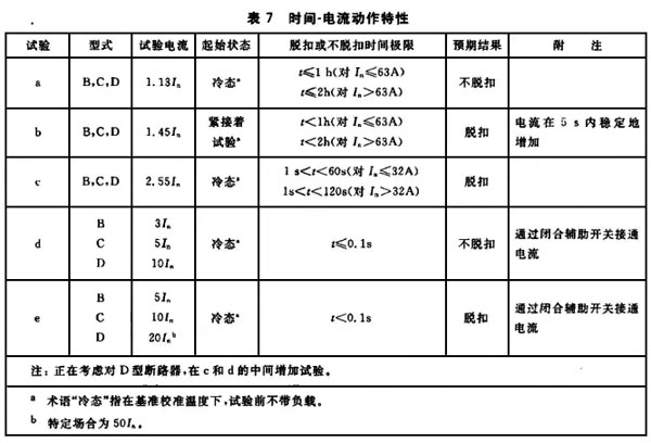 其脱扣特性由GB 10963.1的8.6.1条做出要求,具体试验要求详下表7。可以看到,对于MCB来说,其制造标准要求断路器上通过的电流大于5In(或10In、20In)时,必须在0.1s之内脱扣。