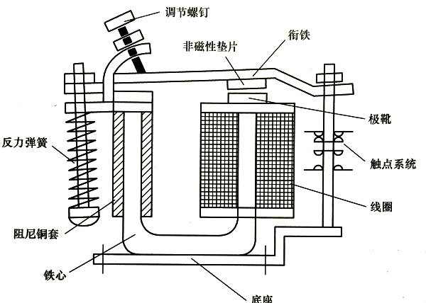 继电器的基本结构和工作原理与接触器相似,由铁心、衔铁、线圈、复位弹簧和触点等部分组成。其结构如图: