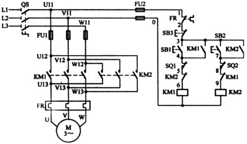 ②反向限位控制。当电动机反向驱动运动部件运动到行程开关SQ2处→SQ2常闭触点断开→KM2线圈失电→KM2主触点断开、KM2常开辅助触点断开、KM2常闭辅助触点闭合→KM2主触点断开使电动机断电而停转→运动部件停止反向运动。