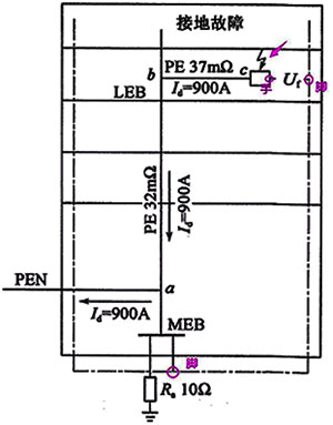可知c和LEB之间只有一个PE支线电阻37mΩ,根据欧姆定律c-LEB之间电位差为900×37/1000=33.3V<50V安全电压。