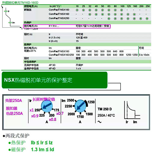 以NSX塑壳来说,250A及以下为热磁式,长延时脱扣器整定电流(Ir)为(0.7~1)In,此处In为塑壳的脱扣器额定电流(In),不是框架电流。