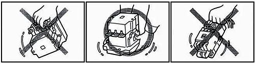 搬运电磁开关时,如果只手拎产品端子、消弧室、热继电器、电线和接线板等部位,可能会发生部件损坏或本体掉落的危险。